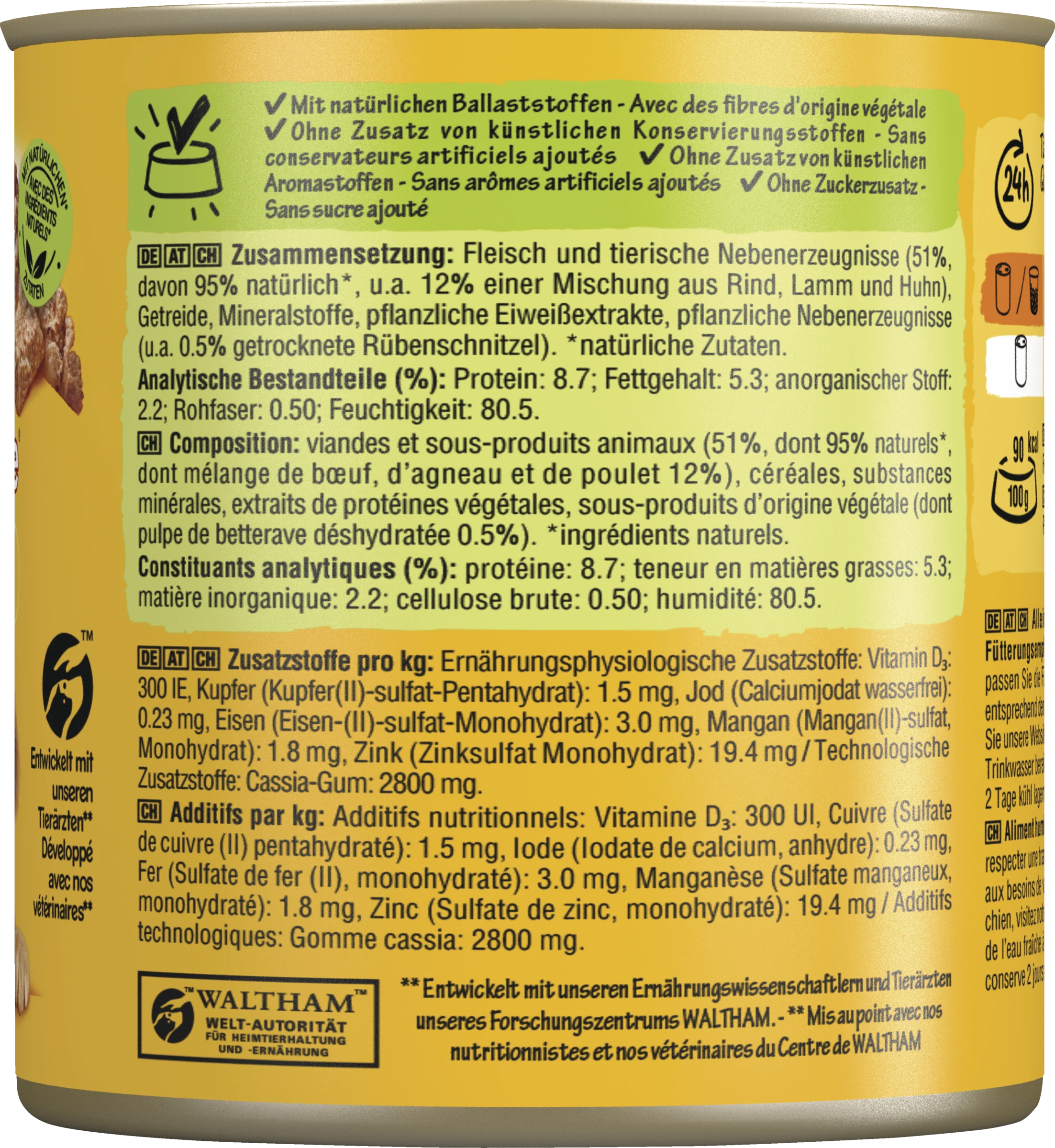 Fleisch und tierische Nebenerzeugnisse (51%, davon 95% natürlich*, u.a. 12% einer Mischung aus Rind, Lamm und Huhn), Getreide, Mineralstoffe, pflanzliche Eiweißextrakte, pflanzliche Nebenerzeugnisse (u.a. 0.5% getrocknete Rübenschnitzel). *natürliche Zutaten.