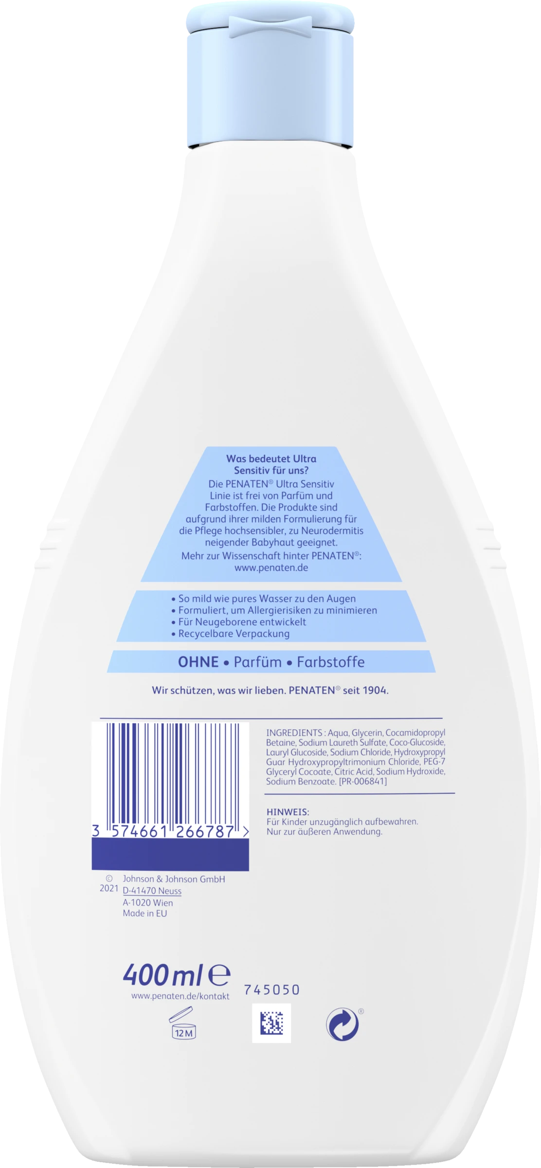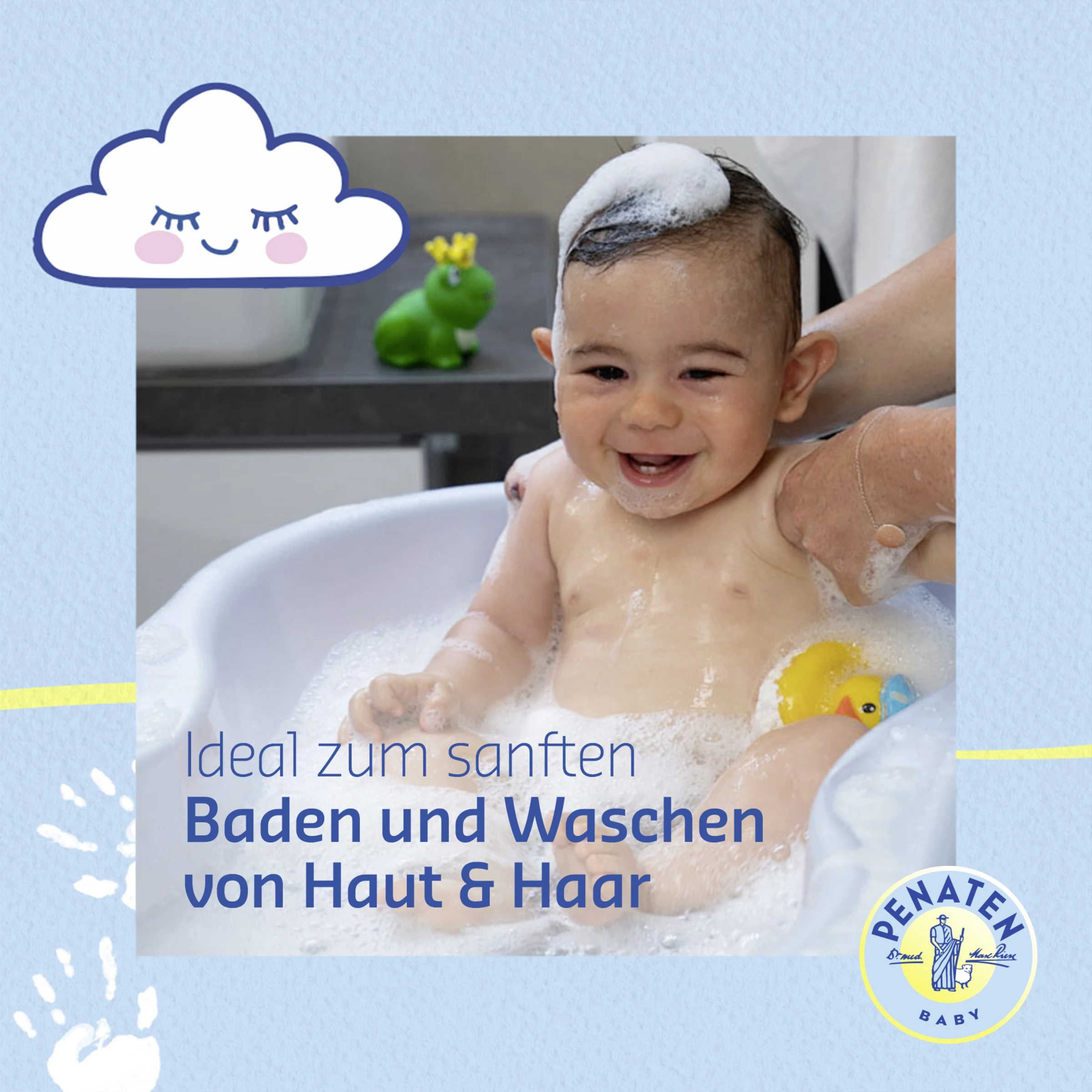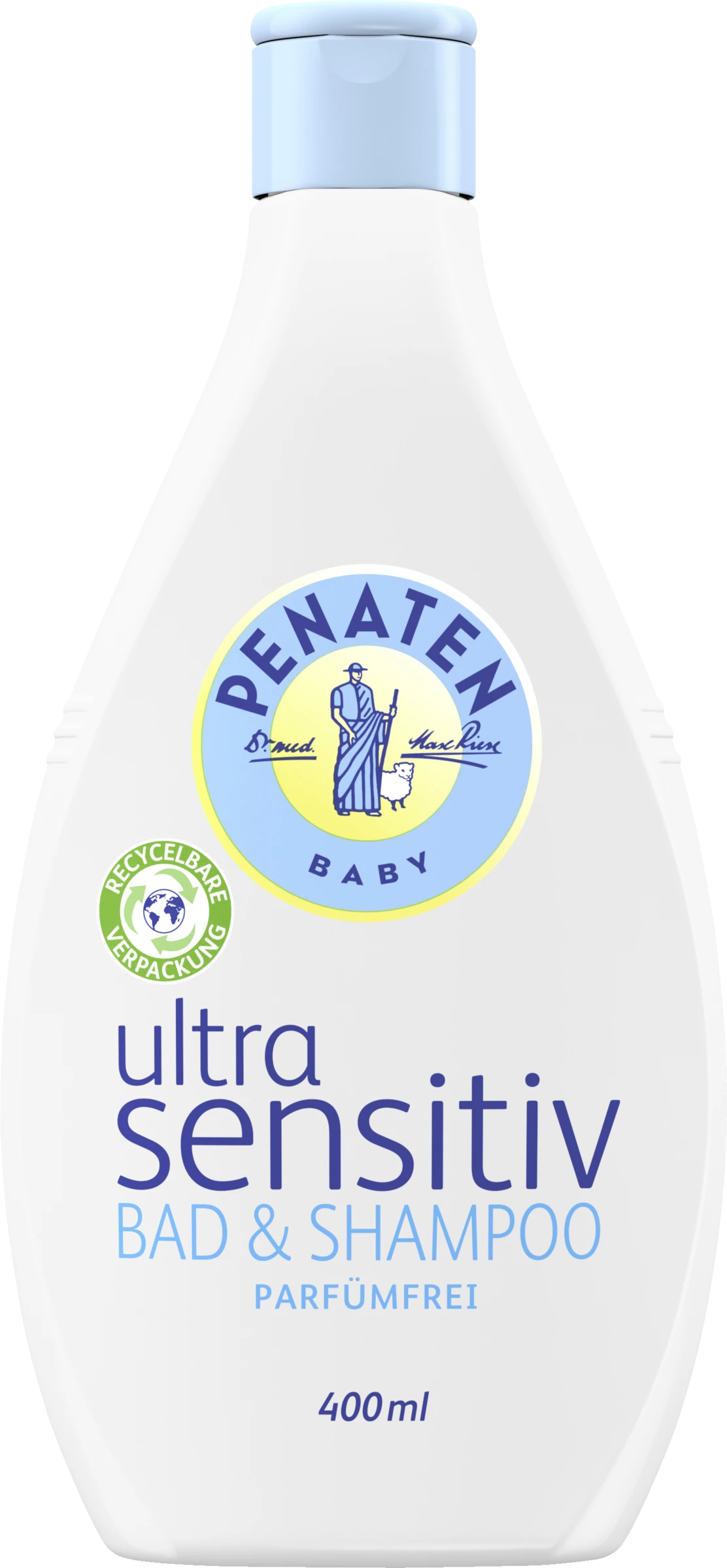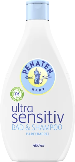 Pflegendes und mildes Babyshampoo & Baby Bad für Haut und Haar. Das Penaten ultra sensitiv Baby Haarshampoo & Baby Duschgel schützt selbst hochsensible, zu Neurodermitis neigende Säuglingshaut, für eine weiche und zarte Babyhaut. Das sanfte Babybad & Babyshampoo von Penaten ohne Duftstoffe und Parfum ist besonders gut verträglich und wurde entwickelt, um ein Allergierisiko zu minimieren, für eine sanfte und milde Babypflege. Die Haut von Neugeborenen ist noch nicht vollständig entwickelt und hat daher noch nicht alle ihre wichtigen Schutzfunktionen. Das parfümfreie Penaten ultra sensitiv Bad & Shampoo wurde speziell auf die Bedürfnisse der hochempfindlichen Babyhaut abgestimmt.Der Deutsche Allergie- & Asthmabund (DAAB) belegt mit seinem Logo, dass die empfohlenen Produkte gut für Allergiker geeignet sind. Die Inhaltsstoffe dieses Produktes wurden vom DAAB als unbedenklich bewertet.