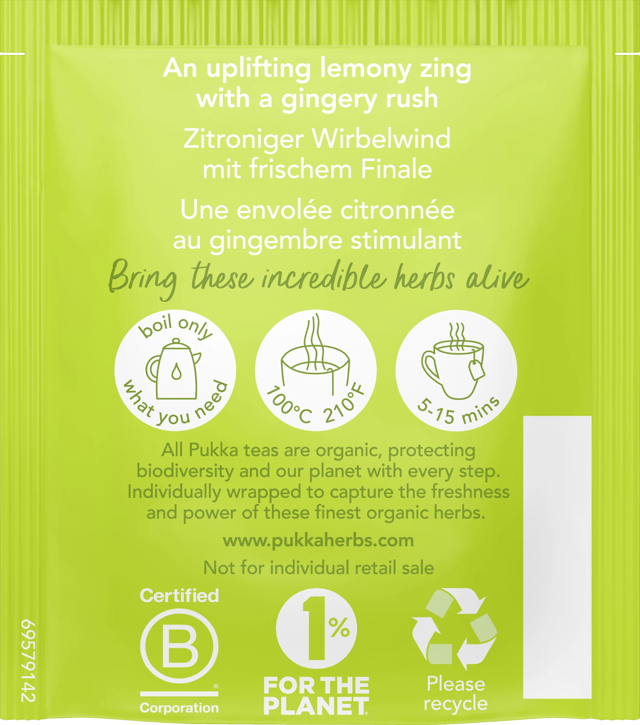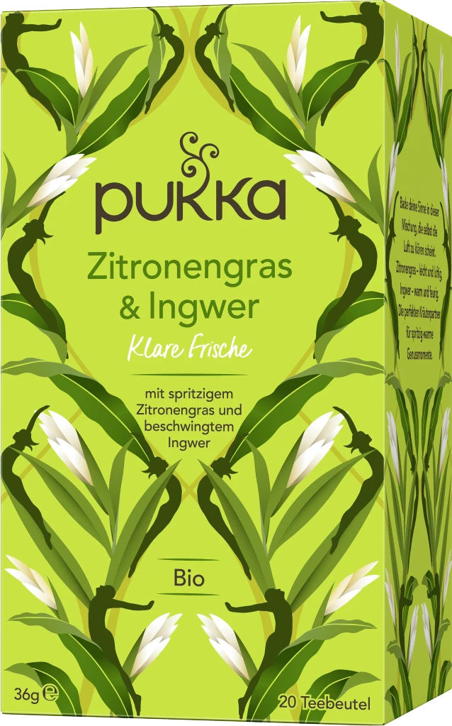 Ein Bio-Tee mit beschwingend-erfrischendem Zitruskick aus feinstem Zitronengras und würzigem Ingwer. Alle Zutaten sind 100% biologisch und werden fair und nachhaltig gewirtschaftet. Durch die Fair for Life- und FairWild-Zertifizierung hilft Pukka seinen Anbaupartnern und hilft, Umwelt & Wildpflanzen zu schützen.
