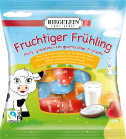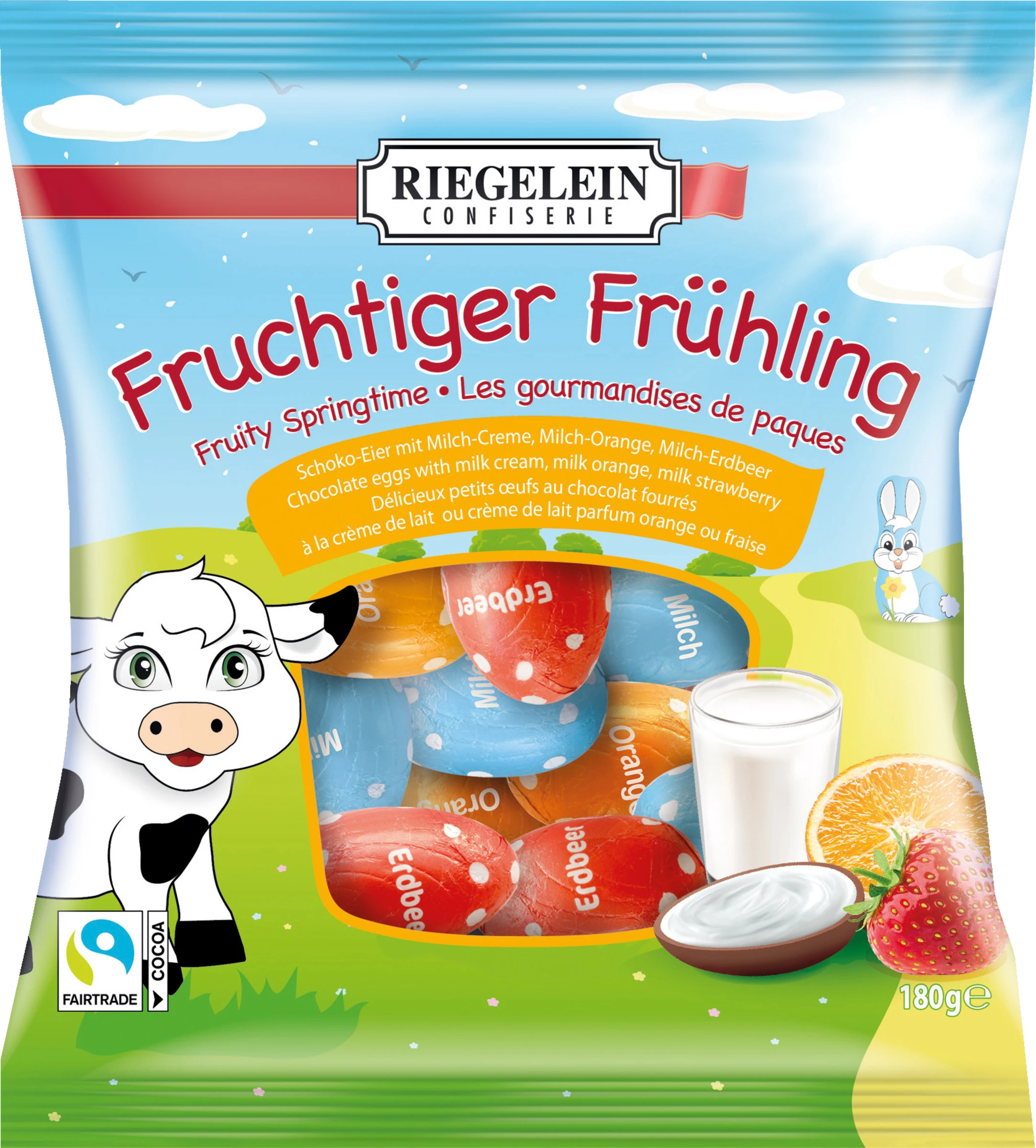 Mischung aus Edel-Vollmilchschokolade mit Milchcreme-Füllung, Milchcreme-Füllung mit Erdbeergeschmack und Milchcreme-Füllung mit Orangengeschmack; Füllung 50%. Kakao: 32% mindestens in der Edel-Vollmilchschokolade.
