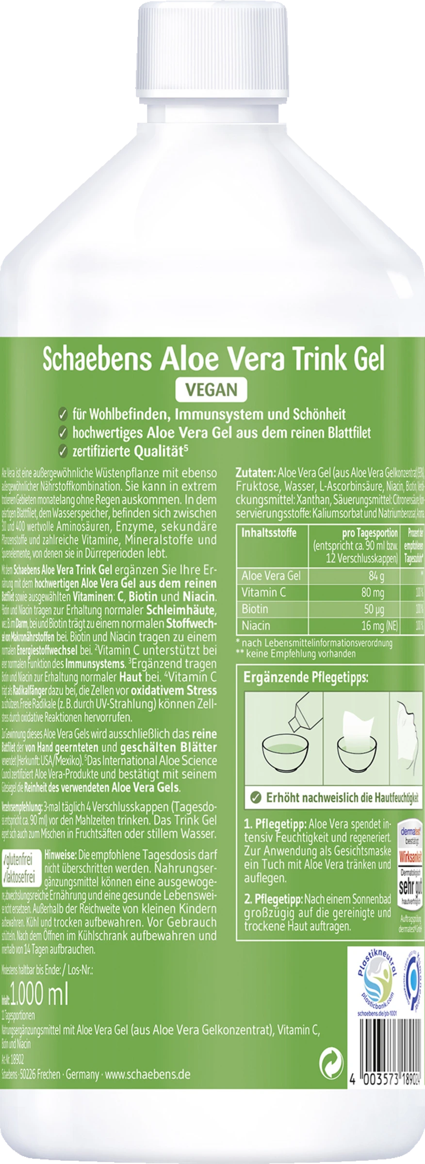 Nahrungsergänzungsmittel mit Aloe Vera Gel (aus Aloe Vera Konzentrat), Vitamin C, Biotin, Niacin