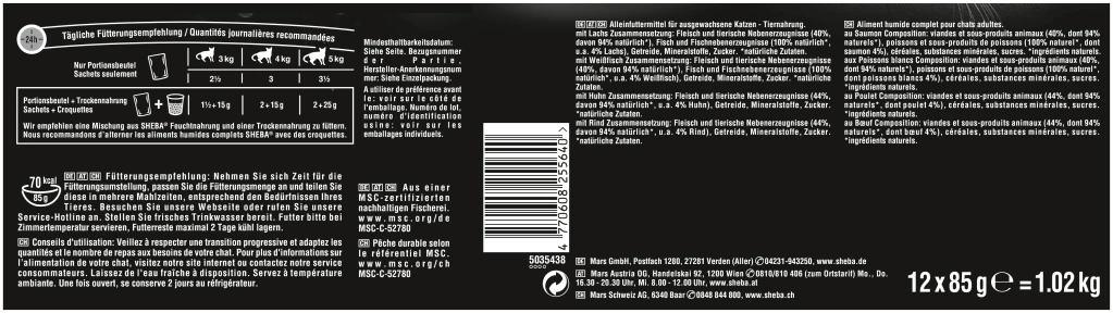 mit Lachs: Fleisch und tierische Nebenerzeugnisse (40%, davon 94% natürlich*), Fisch und Fischnebenerzeugnisse (100% natürlich*, u.a. 4% Lachs), Getreide, Mineralstoffe, Zucker. *natürliche Zutaten. mit Weißfisch: Fleisch und tierische Nebenerzeugnisse (40%, davon 94% natürlich*), Fisch und Fischnebenerzeugnisse (100% natürlich*, u.a. 4% Weißfisch), Getreide, Mineralstoffe, Zucker. *natürliche Zutaten. mit Huhn: Fleisch und tierische Nebenerzeugnisse (44%, davon 94% natürlich*, u.a. 4% Huhn), Getreide, Mineralstoffe, Zucker. *natürliche Zutaten. mit Rind: Fleisch und tierische Nebenerzeugnisse (44%, davon 94% natürlich*, u.a. 4% Rind), Getreide, Mineralstoffe, Zucker. *natürliche Zutaten.