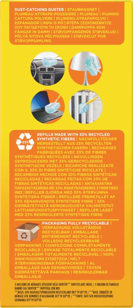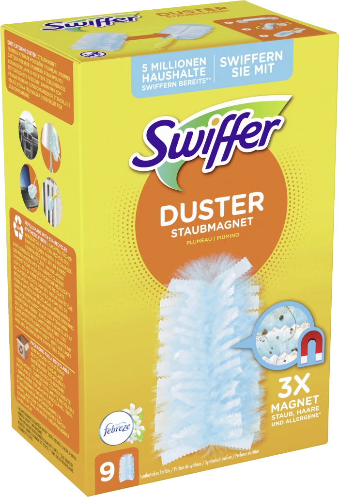5 Millionen Haushalte swiffern bereits*. Swiffern Sie mit! Verabschieden Sie sich von Staub, Schmutz und Haaren! Der Swiffer Staubmagnet nimmt Staub, Haare und Allergene von Staubmilben, Katzen und Hunden auf und schließt diese ein. Dank tausender flexibler, flauschiger Fasern passt er seine Form an und erreicht alle Ritzen und Ecken – so können Staub und Haare täglich von praktisch jeder Oberfläche entfernt werden. Tipp: Besonders praktisch bei Tierhaaren oder wenn Sie an einer Stauballergie leiden. Der Swiffer Staubmagnet ist so schnell und einfach zu verwenden, da macht Staubwischen sogar Spaß. Verwenden Sie Swiffer Staubmagnet Nachfülltücher mit dem Swiffer Staubmagnet Griff.