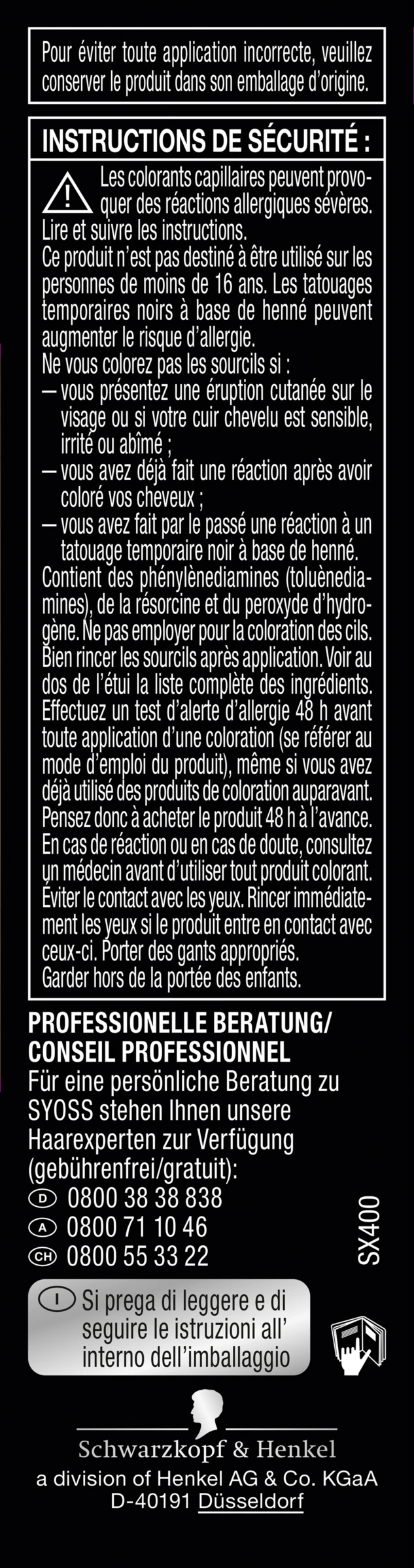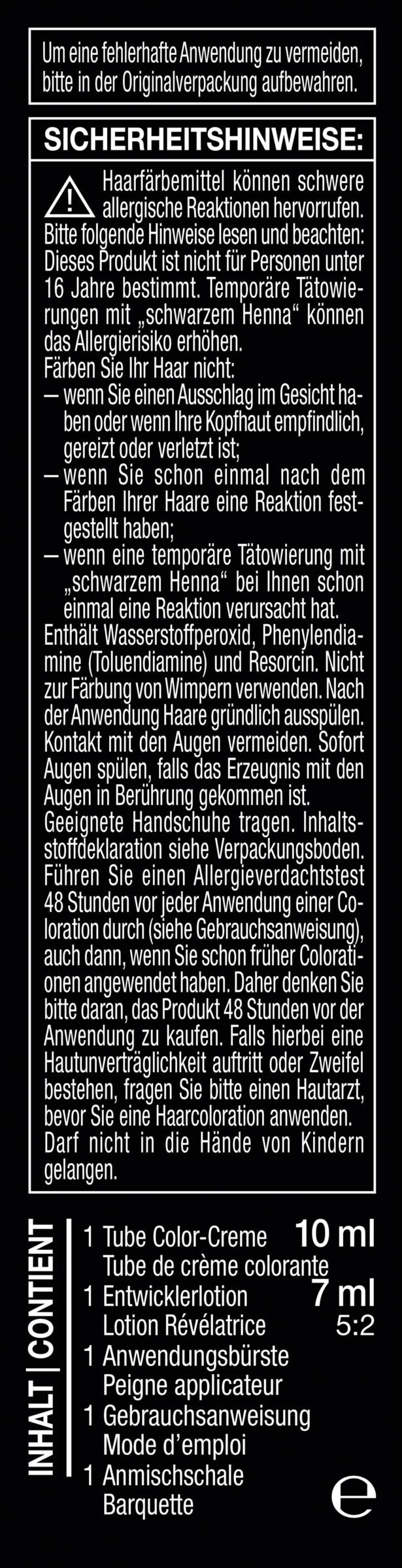 Haarfärbemittel können schwere allergische Reaktionen hervorrufen. Bitte folgende Hinweise lesen und beachten: Dieses Produkt ist nicht für Personen unter 16 Jahren bestimmt. Temporäre Tätowierungen mit “schwarzem Henna” können das Allergierisiko erhöhen. Färben Sie ihr Haar nicht: