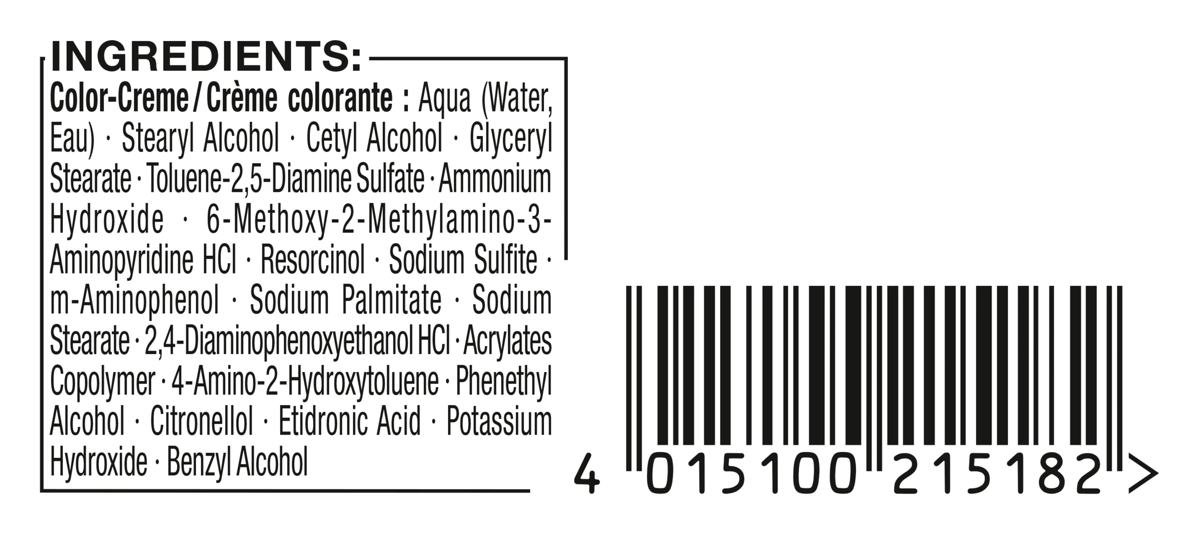 Aqua (Water, Eau), Cetyl Alcohol, Stearyl Alcohol, Glyceryl Stearate, Toluene-2,5-Diamine Sulfate, Ammonium Hydroxide, 6-Methoxy-2-Methylamino-3-Aminopyridine HCl, Potassium Stearate, Resorcinol, Sodium Sulfite, m-Aminophenol, 2,4-Diaminophenoxyethanol HCl, Tetrasodium EDTA, Acrylates Copolymer, 4-Amino-2-Hydroxytoluene, Citronellol, Phenethyl Alcohol, Potassium Hydroxide, CI 77891 (Titanium Dioxide).