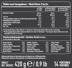Geben Sie 50 g (4 Messlöffel) in 200 ml Wasser und rühren Sie den Drink mit einem Schneebesen glatt oder benutzen einen Shaker. Lockern Sie das Pulver vor dem Abmessen etwas auf. Der praktische Messlöffel ist innenliegend enthalten.