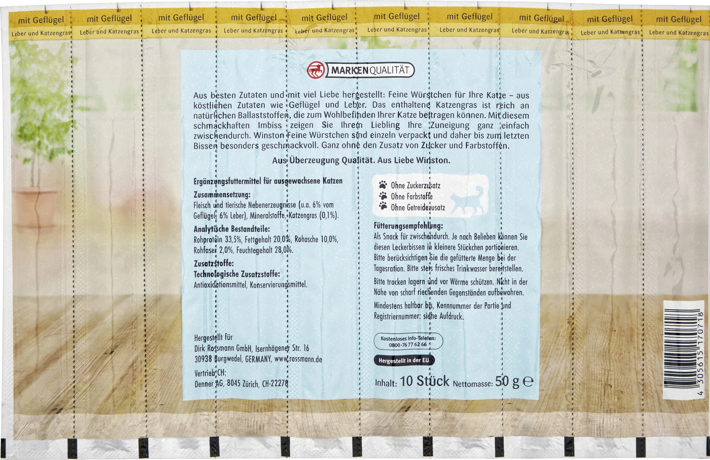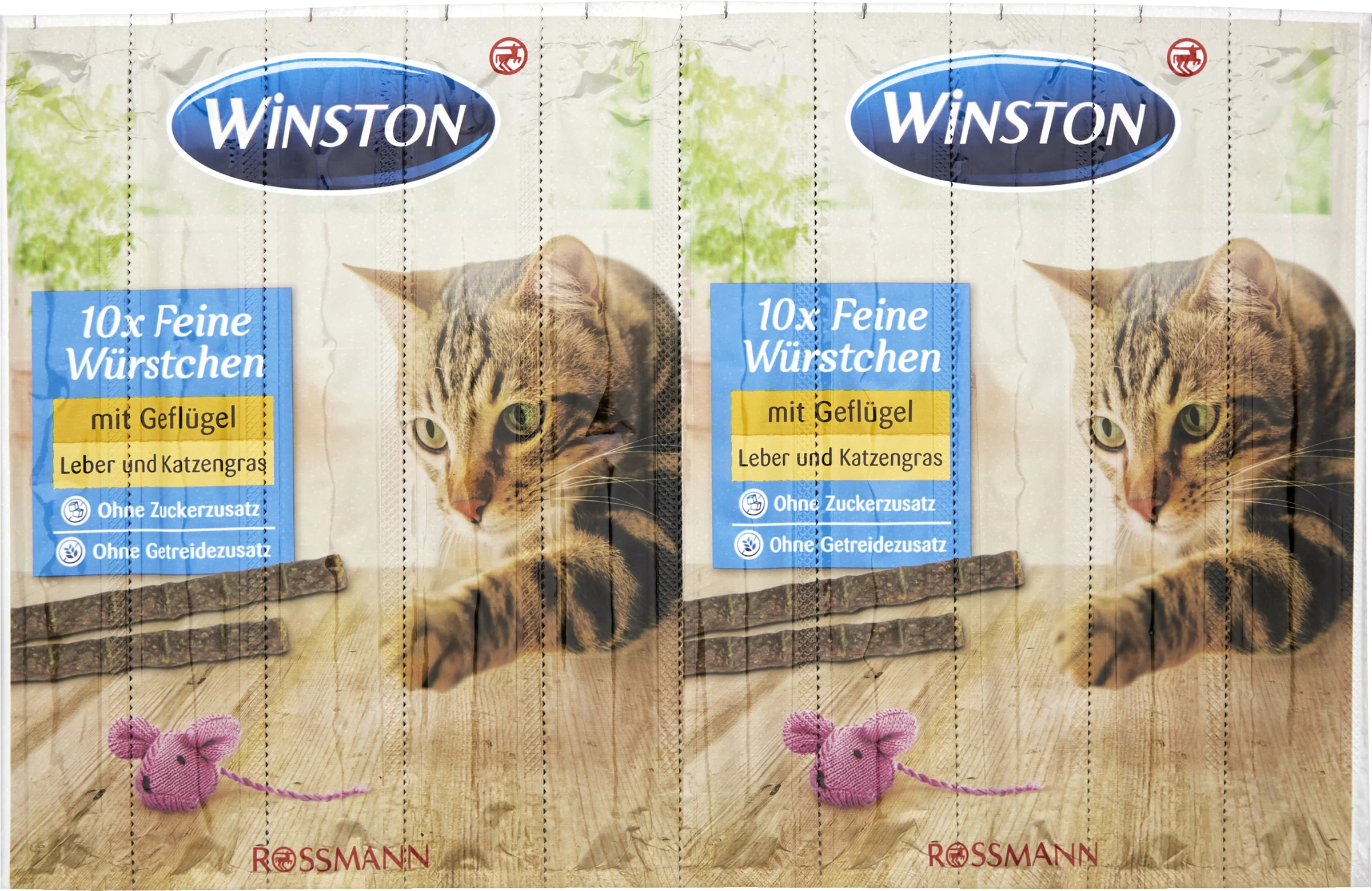 Aus besten Zutaten und mit viel Liebe hergestellt: Feine Würstchen für Ihre Katze – aus köstlichen Zutaten wie Geflügel und Leber. Das enthaltene Katzengras ist reich an natürlichen Ballaststoffen, die zum Wohlbefinden Ihrer Katze beitragen können. Mit diesem schmackhaften Imbiss zeigen Sie Ihrem Liebling Ihre Zuneigung ganz einfach zwischendurch. Winston Feine Würstchen sind einzeln verpackt und daher bis zum letzten Bissen besonders geschmacksvoll. Ganz ohne den Zusatz von Zucker und Farbstoffen. Aus Überzeugung Qualität. Aus Liebe Winston.